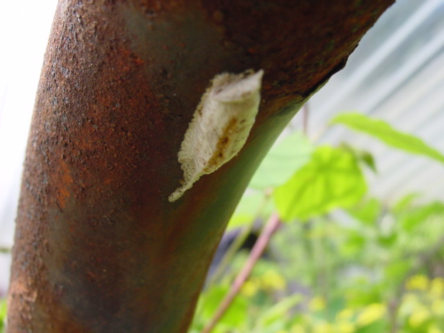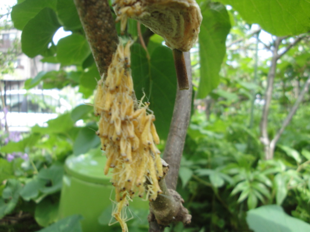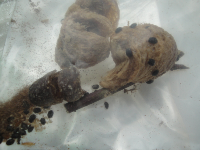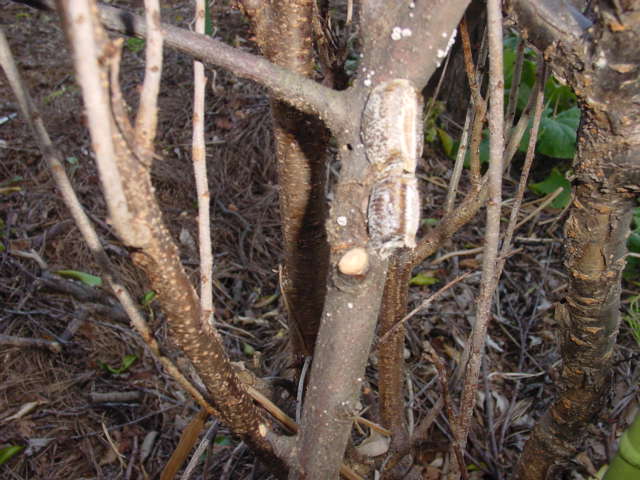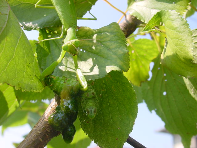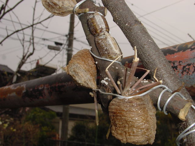 カマキリについて カマキリは毛虫やチョウ、ハエ、コオロギ/バッタ類、油虫等を食べてくれるので菜園の大切な小動物です。以前は、大量に発生していたバッタ類も細々と生息するだけになり、ケムシの親である蝶々や蛾の数もだいぶ減って来た様に感じられます。害虫が全滅という訳ではないですが、果物や野菜の被害があまり気にならない程度に減って来たケースが増えています。 2004年3月にカマキリの卵を数えて見たのですが、スモモ2ヶ所、山椒、ウコギ、ビワ、プルーンに各1ヶ所づつ産みつけてありました。これまでは菜園全体で1〜2ヶ所程度だったので、随分増えたものです。ただ、これ以上増えるかどうかはカマキリの食料事情によりそうです。一つの木に3ヶ所以上卵を産みつけたのを見たことがありませんので、通常の大きさの木なら木一本が縄張りの範囲で、大人のカマキリはそれ以上は食料の関係で生息出来ないのかも知れません。 尚、食料の他にカマキリが増えるのを抑える昆虫がいることも判りました。5月になっても孵化せず卵の塊の一部に穴が空いている場合、カマキリタマゴカツオブシムシという昆虫にタマゴを生みつけられている事があります。親は数ミリのコガネムシを小型にしたようなムシであり、秋にカマキリの卵塊の中に沢山の卵を産みつけます。この昆虫の卵が孵化すると蛆虫を茶色にしたような2、3mmの幼虫となり、冬の間にカマキリの卵をどんどん食べて大きくなりますカマキリの卵を食べ尽くすころには脱皮して飛び立っていく様です。 このカツオブシ虫は、カマキリの幼虫がいなくても卵塊のなかで育つようなので、カマキリが付加した後には、卵塊を回収し発生を抑えるようにしています。 カマキリの生息数の状態等 2004年 − カツオブシ虫によりほぼ全滅状態 2004年5月に4個のカマキリの卵塊を確認したときは以下の様になっていました。 @孵化寸前のカマキリが数匹残って動いている状態であり、カツオブシムシの幼虫も生きている状態。 Aカマキリの卵は食い尽くされた状態であり、カツオブシムシは脱皮した抜け殻のみ残っている状態。 Bカマキリの卵は食い尽くされた状態であり、カツオブシムシの小さ目の幼虫が干からびて死んだものが大半の状態。 C卵塊は小さめだがカツオブシムシの被害は見当たらない状態。 2004年はどうやらCの卵も孵らず菜園にカマキリの子供が全く見当たりませんでしたが、住宅側の庭木の中に沢山の子供が見つかった事から、40匹ほど捕獲し菜園の数ヶ所に放牧(?)しました。 2005年 − 生息数が少し回復 2004年春に放牧したカマキリが何匹か生き残ったとみえて、秋に菜園の手入れ中に10個ほど卵塊が見つかり保管しました。 2005年春に、菜園に戻したところ順調に孵化し、秋には10数個の卵が産み付けられていました。 2007年 − 一気に卵を増やして、生息数の飽和を調査 菜園で活動出来るカマキリの数とカツオブシムシの被害の程度を調べる為、散歩の途中等で見つけた卵を30個程集め、菜園で採取した卵と合わせ43個の卵塊を得られました。これらを5個づつ小枝に固定し、ウコギ、葡萄、モモ、梨、ミカン、スモモ、ビワ、キュウイ等の枝に吊るしました。これで多分菜園はカマキリが飽和状態になると思いますので、害虫の発生状況、秋の卵の数、孵化した割合、孵化の時期にカツオブシムシに食われている割合等を観察・記録してみました。 卵の回収と状況確認の結果(同年初夏ごろ実施)、以下の様な結果と成り、ひとまず回収は有効と判断出来ました。 @孵化が完了しカツオブシ虫の食害もなかったもの 27個 Aカツオブシムシに食べられていたもの(多分春先) 6個 Bカツオブシムシの幼虫がいたもの(孵化は成功) 9個 (多分Aの成虫が今年産みつけたもので、まだ小さなカツオブシムシの幼虫が生息) 2008年 − 生息数の確認 7月初旬にカマキリの孵化は完了したと判断し、卵塊を収集し確認しました。卵塊を開いて見たらカツオブシムシの被害状況は以下の様になっていました。 @カツオブシ虫の被害が無いもの − 8個 Aカツオブシムシの小さな幼虫がいたもの − 9個 Bカツオブシ虫の幼虫の抜け殻があったもの − 1個 (これは昨年既に食害されていたものと思われます) 確認した卵塊は全て焼却処分しましたが、カツオブシ虫に食害食害されている割合が依然高く、今後も春先のカツオブシムシ孵化前のチェック、7月ころの収集、チェック、焼却処分が必要と判断しています。尚、カツオブシ虫が新しい卵塊に卵を産み付けるのは秋ですが、秋に卵をが産み付けられているかどうかはなかなか難しい様で、今のところ産み付けられているかどうかの見分けは出来ていません。幸い秋に産み付けられてカマキリの卵/幼虫が食べられているケースは少なくなって来ていますので(2008年ではBのケースが秋に産み付けられた可能性がある)、カマキリの孵化が完了する6月から7月頃に卵塊を回収すれば、春先に産み付けられたカツオブシムシの幼虫が孵化する前に