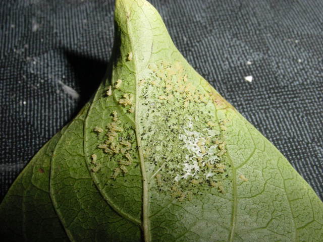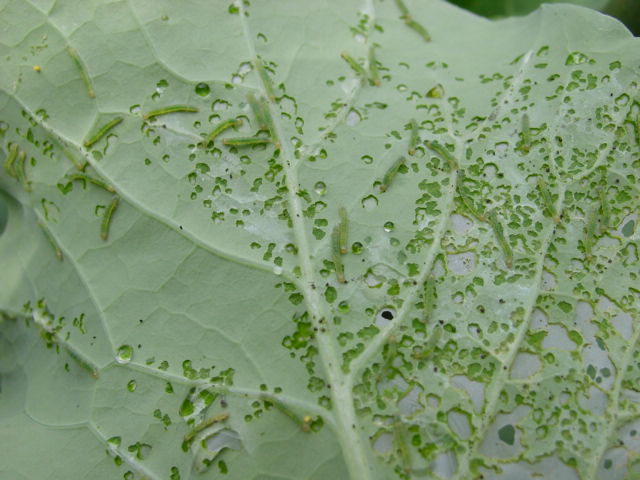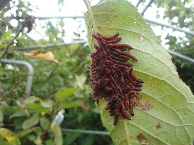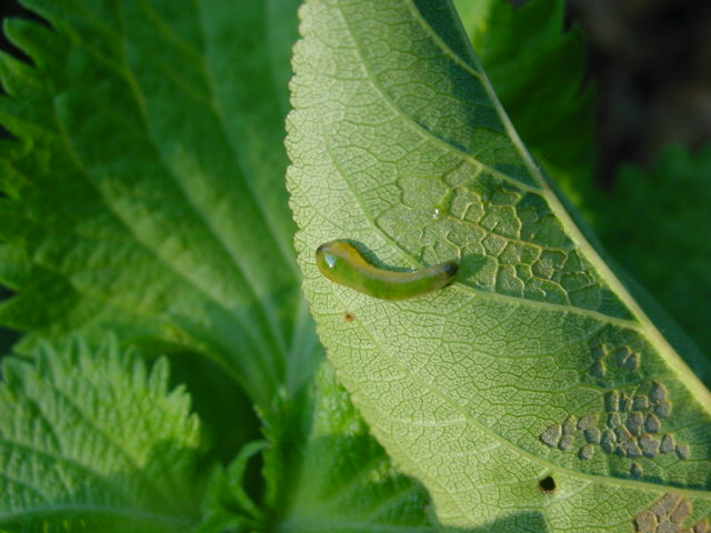 ハバチ: 当菜園では2002年頃〜スモモの木で発生しています。葉が穴だらけになり見苦しいのは勿論、初夏〜秋にかけて大量に発生し大切な葉を食害するのですが、散発的に木全体にまばらに発生し駆除に手間がかかるので毛虫以上に難儀しています。発生したら薬剤で駆除すると比較的簡単に退治出来るようですが、薬剤はカマキリやテントウムシにも悪影響があるので、食害している幼虫を手で一匹づつ捕殺する様にしています。