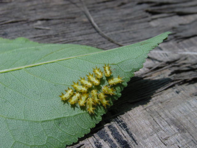イラガ 小さな硬い鶏の卵の様な形をした繭を作るものと、少し盛り上がった長さ2cm、幅 1cm位の繭を作る種類が主に発生種類ですが、たまに青虫のさなぎみたいな形をした目立たない種類も発生します。いずれも触ると非常に痛いので木の手入れや収穫、、駆除するときは十分注意が必要です。柿、スモモ、梨、アケビ、ぶるーべりーに発生します。