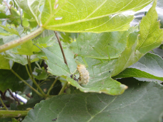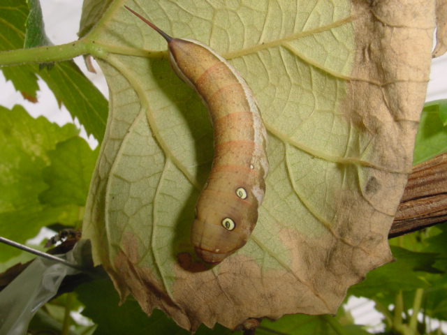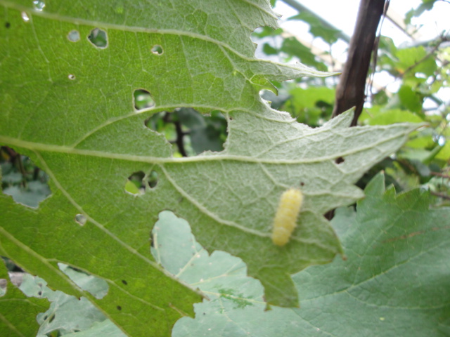 クルマスズメ 葡萄にはあまり毛虫は付かないのですが、このクルマスズメは葡萄の葉が特に好物の様です。大きな木では被害はあまり問題になりませんが、幼苗の場合葉を食い尽くされ、最悪苗が枯れると言う壊滅的な被害になる場合もあります。