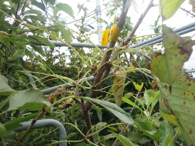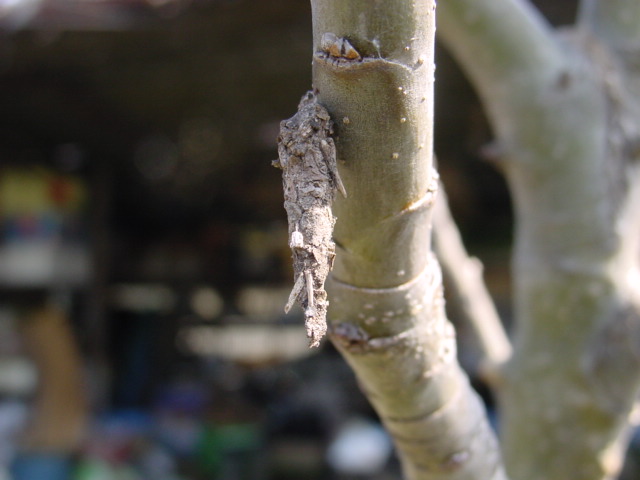 蓑虫 あまり目だった被害はありませんが、数がおおくなると葉が食い荒らされて見苦しくなります。また接木した新芽を食べられることがありますので、特に早春は要注意です。見つけ次第捕殺しておいた方が無難です。