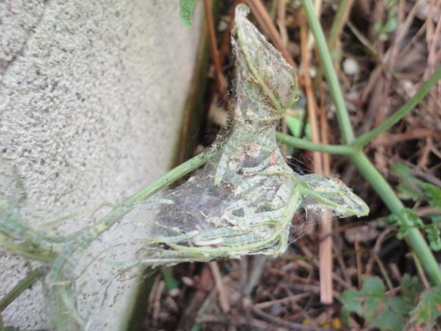 ブドウスカシクロバ: 当菜園では2002年頃〜スモモの木で発生しています。葉が穴だらけになり見苦しいのは勿論、初夏〜秋にかけて大量に発生し大切な葉を食害するのですが、散発的に木全体にまばらに発生し駆除に手間がかかるので毛虫以上に難儀しています。発生したら薬剤で駆除すると比較的簡単に退治出来るようですが、薬剤はカマキリやテントウムシにも悪影響があるので、食害している幼虫を手で一匹づつ捕殺する様にしています。