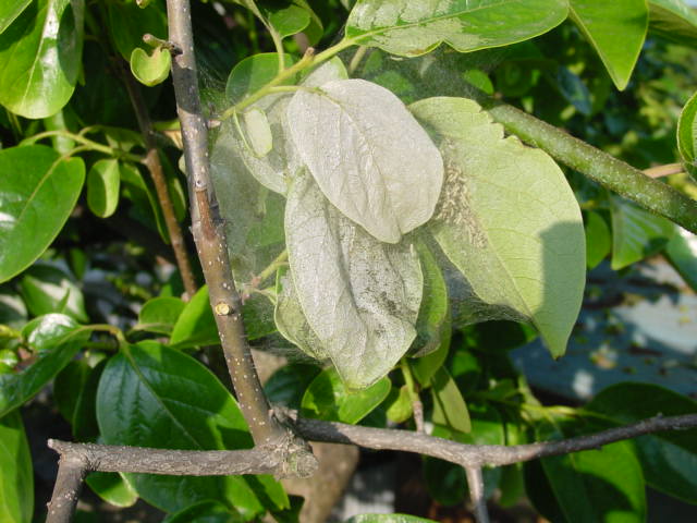 アメシロ 極めて食欲旺盛であり、多発すると一本の木を丸坊主にし、さらに別の木に移動します。柿の木等の葉っぱが黄色くなっているのはアメシロの被害が多いようです。柿、梅、スモモ、梨、プルーン、モモに発生します。時々キュウイや葡萄にも発生しますが、あまり広がりません。