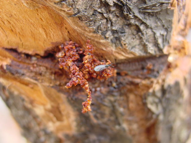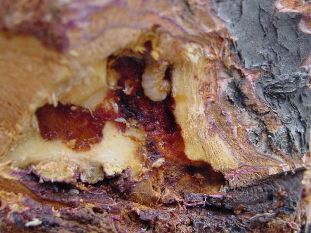 コスカシバ 木の表皮の部分に食い入り、虫糞をだしながら、幹の浅い部分や形成層を食い荒らします。木が弱り、最悪枯れてしまうこともありますので、虫糞を見つけ次第皮を剥き駆除しておく必要があります。