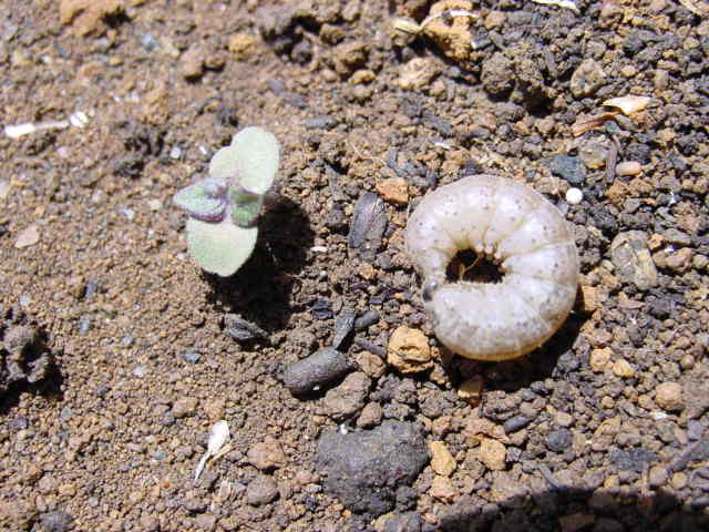 テッポウムシ テッポウムシと言われているのはカミキリ虫類の幼虫です。木の幹に食い込んで芯の部分を食い進むので芯食い虫とも呼ばれている様です。リンゴや無花果、葡萄等で被害が多く出るようで、最悪の場合木全体を枯らしてしまいます。 コスカシバの幼虫の場合、表皮の部分だけの食害ですが、テッポウムシの場合幹の中心付近を食い進み、食害の量はけた違いです。木の所々に穴が開き、虫の糞が吹き出していたらテッポウムシの被害を受けている証拠です。 虫糞が出ていたら、早めに殺虫剤を注入して駆除する必要があります。 家庭用の噴射用のノズル付き殺虫剤であれば、ハエや蟻、ゴキブリ用等何の殺虫剤でも良い様ですが、出来れば効能にキクイムシやシンクイムシの表示が有った方が確実かも知れません。噴射ノズルを穴に挿入し、穴の周りをガムかなんかでふさぎ殺虫剤を注入します。虫の食い進んだ穴が長くて生き残る場合もありますが、1,2ヶ月して虫糞が出ていたら再度注入すればほぼ100%駆除出来ます。 ネキリムシ ネキリムシという正式名称は無いかもしれませんが、老齢幼虫になると土の中にもぐり、植えたばかりの野菜苗を根元から食いちぎる毛虫を勝手にネキリムシと呼んでいます。