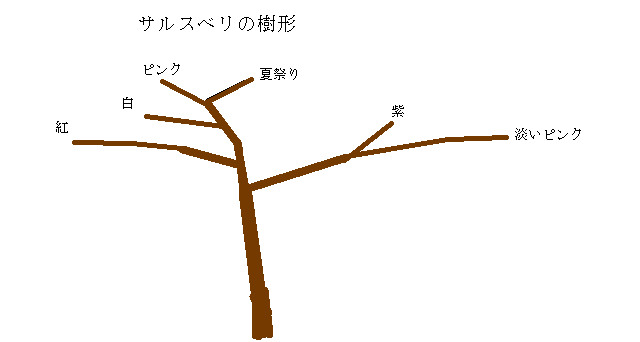 我が家のサルスベリは通常のピンクと薄いピンク(写真左端)の2種が咲く様になりました。 |