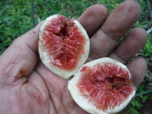 果皮黄緑の下地に紫のストライプ、果肉ピンク。中粒。