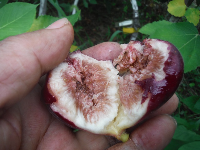 果皮茶色に赤褐色の縞、果肉赤に近い琥珀色、果重40g程度。夏秋兼用。 シュガーベリー風味。 多産系。