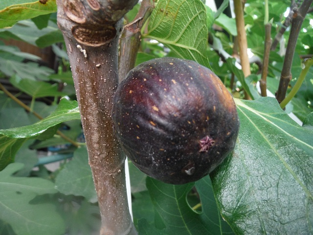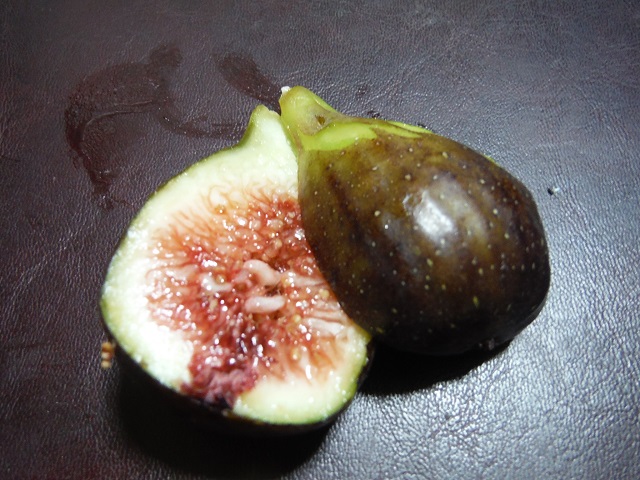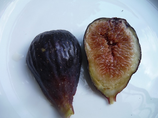 果皮やや薄い紫、果肉赤の中果です。接木してすぐ実が多めに着きましたので、着果し易い品種の様です。