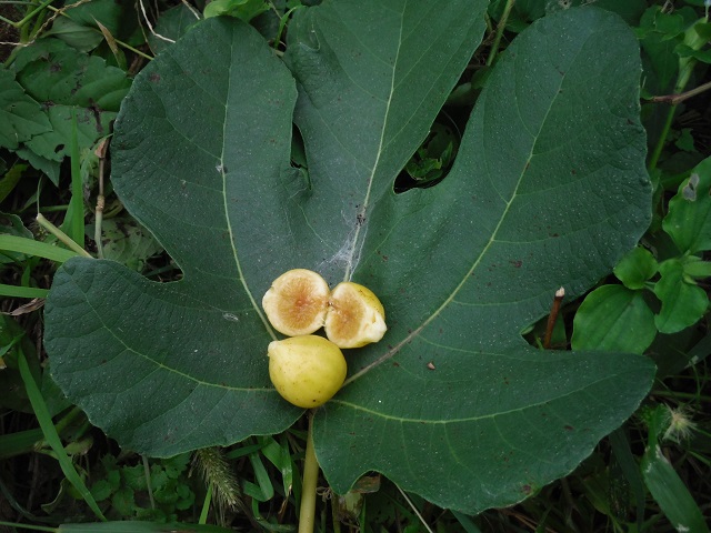 庭多品種接ぎ台木(ドーフィン)の着果の状態です。比較的小型の黄色の実がなります。