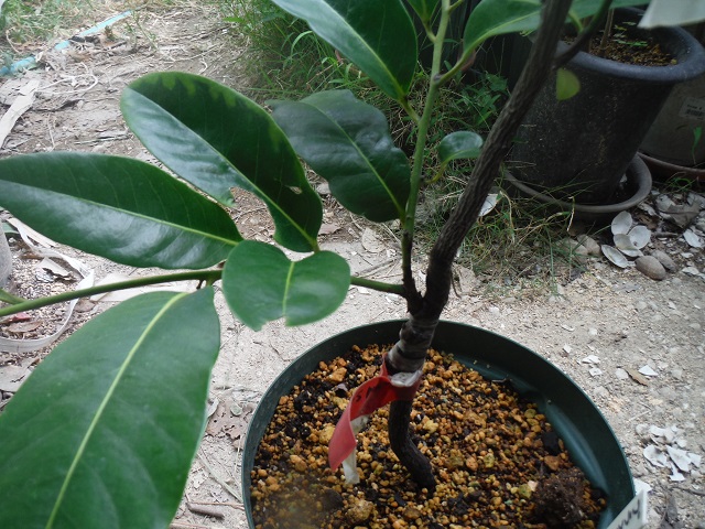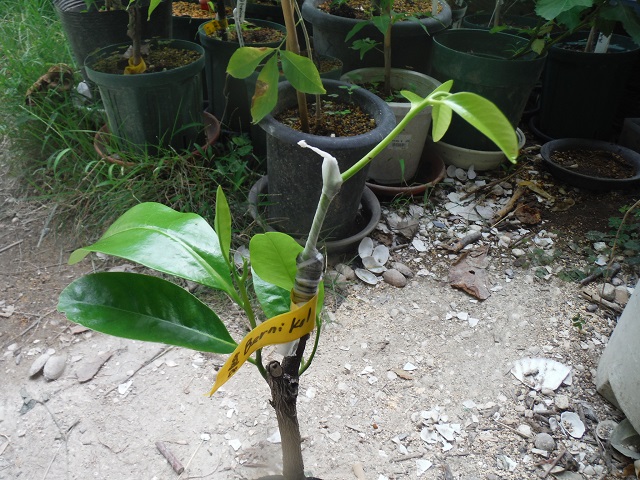 5月23日に接木したMosmanの例です。前年生育し充実した穂木を腹接ぎで接木したものです。 |