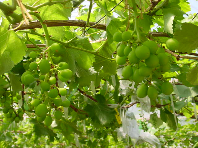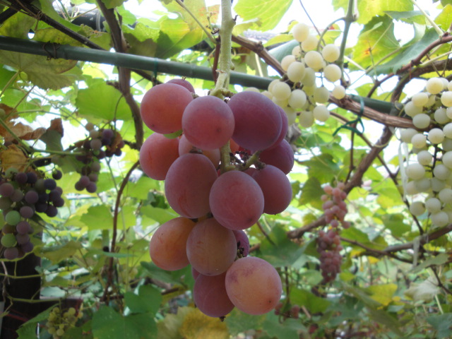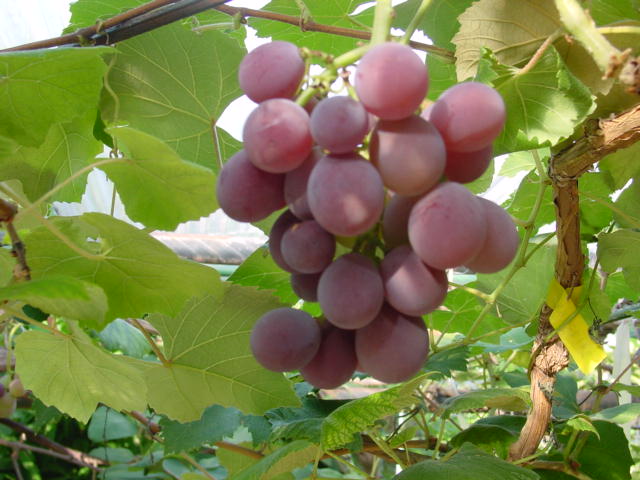 シナノスマイルについて 巨峰と同じくらいの大きな実がなり、ピンクの綺麗な実がなります。日光の加減で着色状態が変るので、理想的な着色を行う為には日光の加減が少し難しそうです。 でも、色が多少変わっても味はあまり変らないようですので、趣味で育てるならあまり気にすることはないですね。 花振るいは殆どないので、房の作りは容易ですが、房の整形と適粒を行わないと実が成りすぎる傾向があります。 その為もあると思いますが、枝の登熟は不完全になりやすく、次年度の結果枝が上手く出来ない事があります。