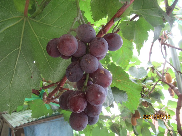 葡萄について 葡萄は実は良くなるのですが、雨が多い日本では品質の良いものを作るのは難しいと言われます。植えて数年は病気があまり出なくても、何年かすると果実が黒く変色し腐る晩腐病や黒い斑点の出る黒とう病が発生するようになる事が多いようです。一度この病気になると毎年続け発生するので、食べられる状態の実を収穫出来なくなることはもちろん、若葉に黒い斑点が出る黒とう病が発生し、木が生長しないで植えたままの状態になってしまう事もあります。 これらの病気は雨により活発に増えますので、雨があたらないようにするか、病原菌がいない状態になるようせっせと消毒する必要があります。雨があたる環境では、このような病気に強い品種を選択し、石灰硫黄合剤やボルドー液で消毒するのが最低限必要な作業と思われます。 宮菜園では、消毒は行わず又袋かけも不要になる様、雨があたらない様にする方法を目指しています。 種類
