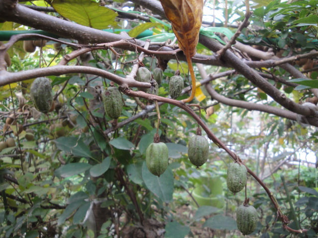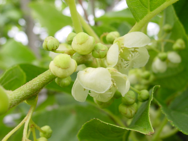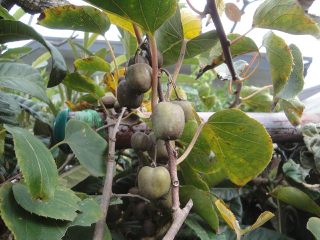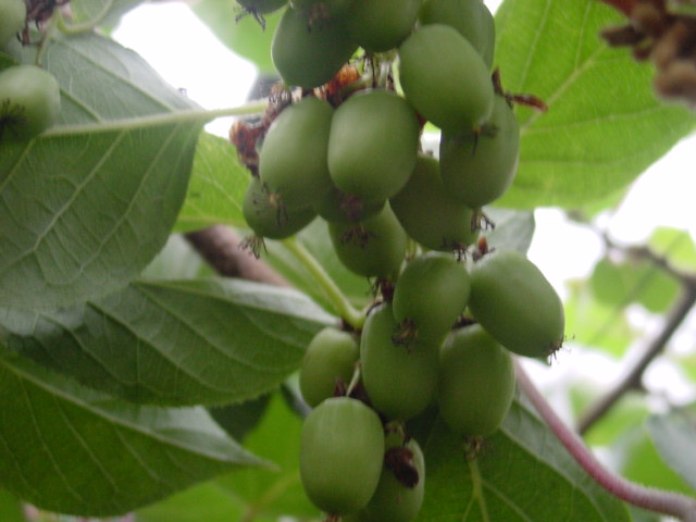 サルナシについて サルナシはキウイの原種と言われ、中国からニュージーランドに渡り本格的な改良が行われ、現在のキウイになったようです。近年サルナシも色々な品種が出ており、鑑賞用が主体になるとは思いますが、独自の地位を築いているように思われます。岩倉菜園に遊びに行ったとき育てていたサルナシに興味を持ったのが栽培を始めたきっかけです。 種類: @岩倉さんちのサルナシ 岩倉菜園で育てていたサルナシの穂木を頂き、2007年に接木し、2008年に初収穫を行ないました。 小型の緑色の実がなります。品種名は不明ですが、旧来から存在する品種のようです。
