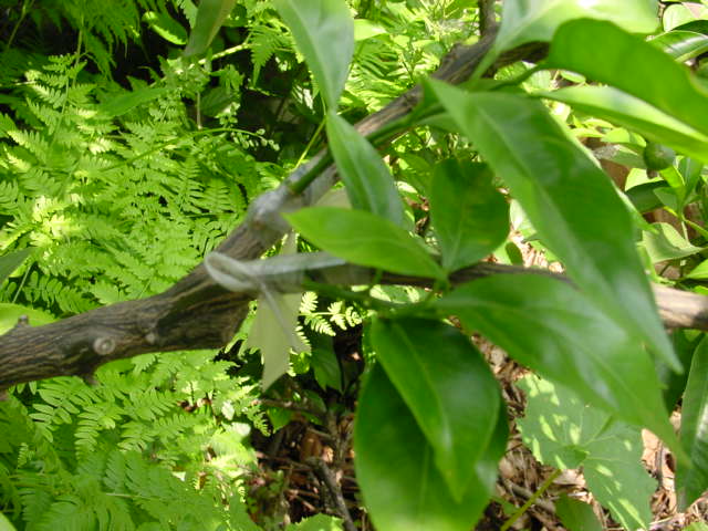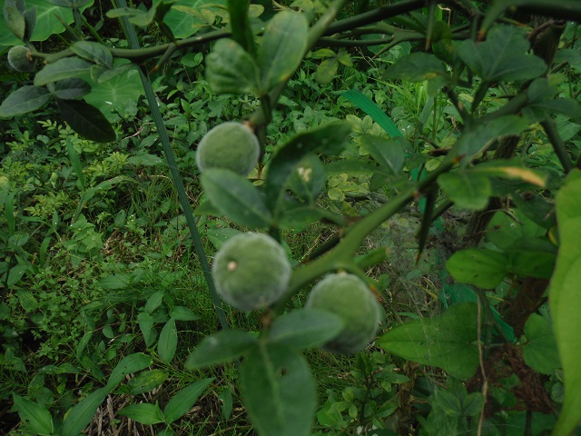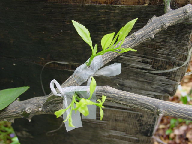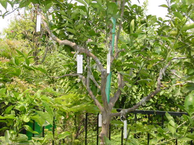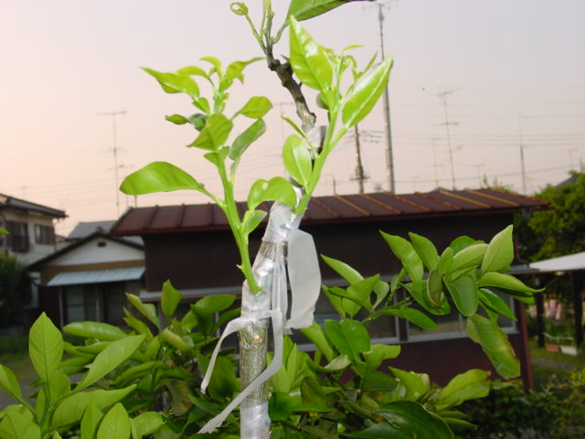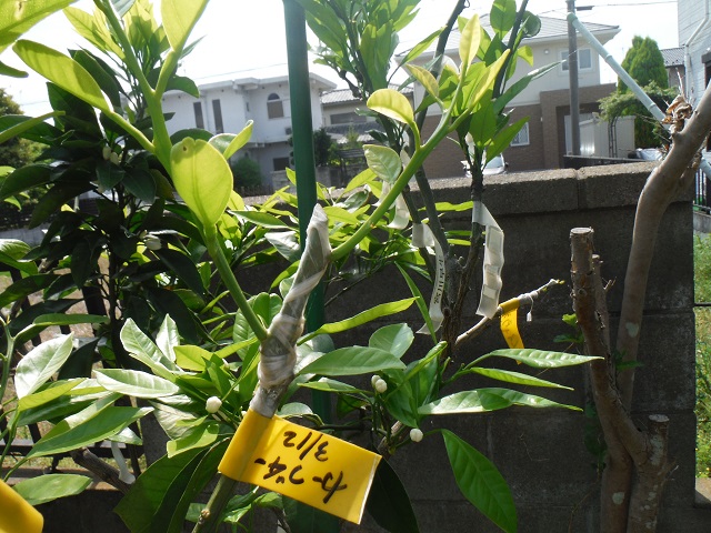 実生苗、台木、接木について 柑橘類の実生苗は、比較的親の性質に似たものになるという事で、何種類か食べた後の種を蒔いて育てています。まだ実生苗の実の確認が出来たものはありませんが、気長に育ててみたいと思っています。 ただ、実生苗は実が成るまでに20年ほど必要な事が多いようですので、色々の種類を試す為には接木が重要になります。 実生苗の実をならせると言うのは、もの好きな趣味の世界の事か新品種開発等の研究分野の事なのですが、実は柑橘の生産において、実生苗は苗の台木としてなくてはならない存在となっています。 近年は新しい品種の台木も出来ているようですが、長い間カラタチの実生苗が柑橘類の主要な台木として利用され続けています。 実生苗の柑橘類 以下の柑橘類の実生苗を育ててみています。 フルーティー、土佐ブンタン、サンフルーツ、紅甘夏、三宝柑、マーコトオレンジ、グレープフルーツ(黄)、グレープフルーツ(ルビー)、イヨカン、カボス、ヒューガナツ、スイーティ、サンクイーン、小ミカン、紅八朔、アンコールオレンジ、タンカン、セミノール、清見オレンジ、ジューシー、紅マドンナ等。 接木の経過 ミカンは私の菜園では比較的新米です。最初は早生2種、ユズ、夏みかん等をそれぞれ植えていましたが、場所が狭い関係から、一本の木に色々な柑橘類を集約出来ないかという事で始めたのが、接木のきっかけです。接木は最初はなかなか上手く活着しませんでしたが、宮式高接方式考案・導入と経験を積む事により成功率も上がり、近所や知り合い等から新しい品種を頂く事も多くなり、、種類も大部増えて来ました。 以下は接木による枝の種類の増加状況です。 2001年の結果 結局夏みかんだけが成功しました。成功率20%位。かんきつ類の接木は以外と難しい! 又今年の秋と来年春に挑戦します。 ポイントは、以下のようです。 @なるべく太目の充実した枝(その年伸びた枝)を使う A芽が出る部分以外テープでしっかり巻き接いだ枝の水分が蒸発しない様にする。 B切り口をしっかり合わせる。その為、あまり接ぐ枝は長く無いほうがよさそうです。 2002年の結果 2001年の結果を踏まえ、主に2〜3月にユズ、花ユズ、金柑、八朔、ミカン、ポンカンを各3〜4箇所に接木しました。結果は23箇所接木し成功19箇所、成功率82%でした。いずれもの種類も2箇所以上活着しましたので、まずまずの成功確率と思います。これならほぼどんな柑橘類でも接木可能という自信が出来ました。2年目で変身!柑橘類の接木は以外と簡単!! 2003年の結果 レモン、グレープフルーツ市販苗、グレープフルーツ実生1(赤実)、グレープフルーツ実生2(黄色実)、スダチ、ネーブル、スイーターの接木を行いました。 実生のグレープフルーツ2種(赤実,黄実)は失敗。いずれも接穂が少し細く枝が充実していなかった事に加え、同じ枝に沢山接木したので栄養が行き渡らなかった様です。 2004年の結果 昨年失敗した品種とデコポンの接木を行いました。 デコポンは接いだあとの生長が早く秋には1m以上に伸びました。ミカン類は充実した穂木を3ヶ所程接木すれば、ほぼ間違い無く2ヶ所は成功する自信を得ましたので、今後は近所や知人などが植えているもので変わったものがあれば穂木を分けていただき、少しずつ種類を増やして行きたいと思っています。又、実生についてもなるべくトライしてみようと思っています。 2006年の結果 2006年も幾つかの種類を接木し、順調に種類が増えると安心していたのですが、2005年に実を成らせ過ぎたのと2006年2月頃にマイナス5度C位の寒波が続いた為と思われますが、6種程接木し2種しか成功しないという散々な結果となってしまいました。しかも接木どころではなく上の方の枝は凍害により、かなり弱ってしまいました。今後当面実成りをもう少し制限し、あまり施していなかった肥料も与え樹の勢力を向上させてから再度接木の数を増やしたいと思っています。 なんせ、枝の勢いが無いと接木どころではない状態に成ってしまいます。 その他、風が強い日が多かった為か、接木テープに直接書いた品種名の部分がちぎれ、せっかく接いだ幾つかの品種名が判らなくなってしまうという失敗もありました。2007年からは別途黄色のビニールテープに品種名を書いて巻きつけています。 その後の接木 2006年までの結果を踏まえ、台木の樹勢を確保、品種名の確実な記載、新たな台木の導入等により、安定した活着が得られるようになっています。現時点ではモモやスモモ等と殆ど変わらないほど容易に接木出来る状態となっています。