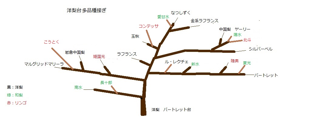 | 多品種接木について モモ、スモモ、プルーン、梅/アンズ、リンゴ、梨等それぞれの木種同士で多品種を接いで育てるのは、一部の例外を除いて、概ね問題なく生育します。本ページでは、スモモにモモやプルーン、梨にリンゴ等、異なった果物の木種を接いで育てる例を多品種接木としてご紹介しています。 現在確認出来ているのは、以下の2種のグループです。 @ スモモ ≧ 梅/アンズ >プルーン >桃 A 洋梨 > 和梨 > リンゴ 上記各グループ内では相互に接木可能ですが、≧ や>で示した様な樹勢の強弱があり(この場合左側の品種の樹勢力が」強いことを示す)、枝の勢力調整が必要です。 例えば、@のグループでは、枝の勢力が強くなる上の方(頂芽優勢)に樹勢の弱い桃を配置し、なるべく勢力を強くする様な処理が必要です。 以上は枝関係の基本の考えですが、台木によって樹全体の生育状況が変わってくるため、実際育てる場合、台木、中間台、枝の配置などを試しながら試行錯誤の育成となっています。 ここでご紹介しているのは、その試行錯誤の段階の例として、失敗を含めて参照して頂たいと思います。 スモモ、桃、プルーンの多品種接木ース台+プルーン台 ス台に告いだプルーンがメインですが、それにスモモのバイオチェリーを接木し、バイオチェリーに桃、プルーンを接木して育てています。 現状、大きな生育上の問題は発生しておらず、プルーンが十分な収穫が出来、バイオチェリーも少しですが着果、桃の収穫は今後の枝の生育次第という状況となっています。  スモモ、桃、プルーンの多品種接木ースモモ台 スモモに桃やプルーン、梅/アンズ等を接いで育てている例です。 これは、あまり望ましくありませんでした。桃の枝の伸びが特に悪く、プルーンも生育があまりよくありませんでした。ほぼ、失敗の例となりました。  梨、リンゴの多品種接木 − 洋梨台 洋梨に和梨やリンゴを接いでいる例です。  2022年3月22日更新: 生育状態に関する説明、ス台+プルーン台の樹形追加。 2017年12月31日更新 | |