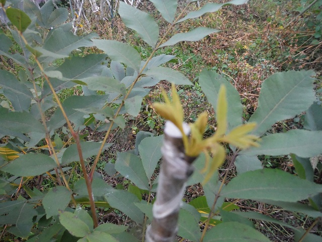 5月21日にポーニーを胡桃(豊笑)に接木して見ました。胡桃の新鞘にペカンの休眠枝を接木した形になります。--->残念ながら、台木が枯れポーニーも枯れてしまいました。ペカンを接いだから胡桃が枯れたのか、胡桃の剪定過多だったのか等の理由は不明です。 |