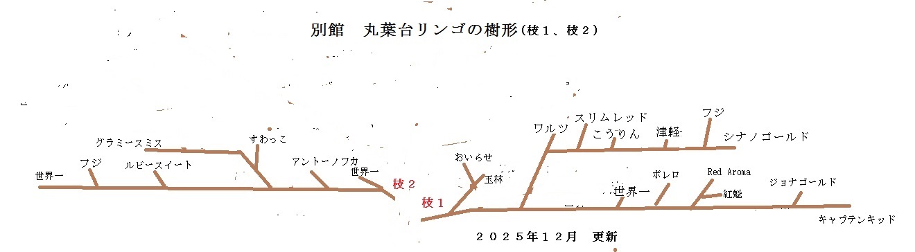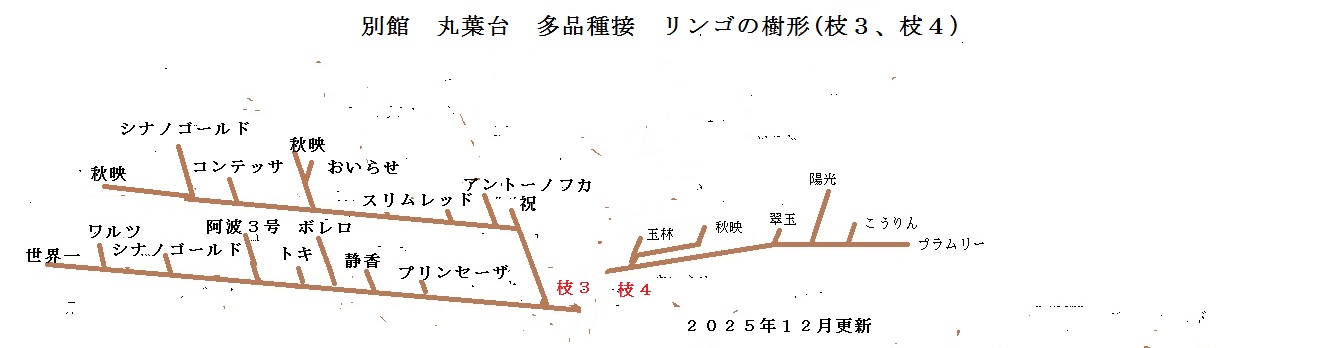 7444 ,品種登録日 1999/09/21、消滅日 25年)、M9(品種登録無し)、丸葉台(品種登録無し)、品種不明の矮性台木を育てています。 |