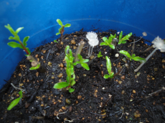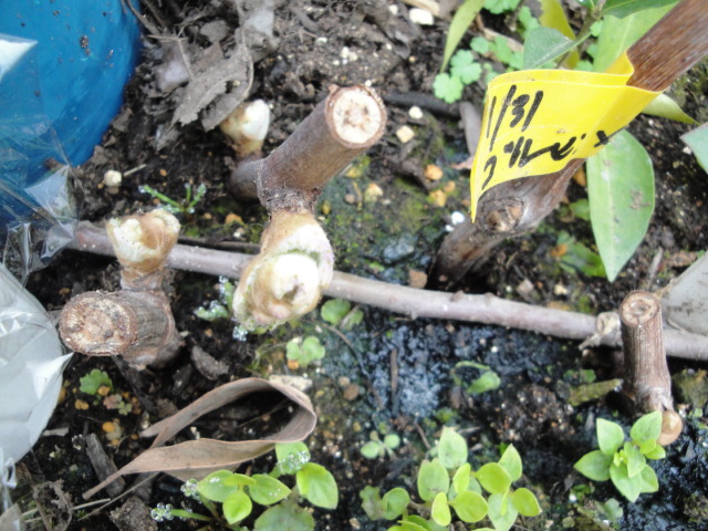 従来の手法による挿し木 挿し木の経験はそれほど長くないのですが、失敗が多いながらも手軽な為用いている手法です。 概ね寒い時期に、トロ箱や植木鉢に挿し、乾燥防止の為ポリ袋で密封する方法です。水分は土から供給するよう、トロ箱や植木鉢は半分位土に植えます。こうすると、最初にたっぷりと水を与えると、あとは給水不要です。少なくとも何もしないで乾燥だけは防げます。又比較的小規模の密閉式の温室でも同様な効果が得られます。いずれの場合も、温度が上がりすぎる時期は挿し木には向きません。 尚、従来の手法言葉はあくまでも個人的なもので、一般的な従来の手法という意味ではありません。現在の自分の菜園に費やす事が可能なタイミングと時間長から言って、本手法で行えるものは今後とも利用していくつもりです。成功例をご紹介してもあまり面白くないと思いますので、失敗例の方が多くなると思います。 2010年-1 植木鉢への挿し木は黒かびとキノコの発生 今年第一号の従来方式による挿し木は黒かびによるほぼ失敗に近い状況です。 この後、挿し木の土は、赤玉土(又は鹿沼土)+バーミキュライト(保水用)+モミガラクンタン(殺菌用)+種蒔専用の土(栄養) にて行う事としました。 種蒔専用の土は栄養分があるので少し不安なのですが、完熟という様な説明が合ったので、とりあえず使ってみる事としました。 肥料の全く無い挿し床が良いのか、少し肥料があった方が良いのか、まだ把握出来ていない状態です。