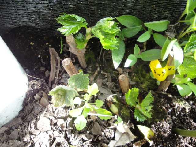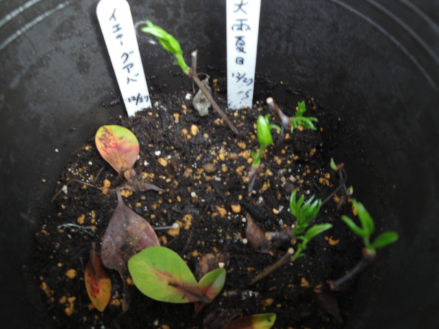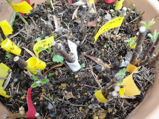 2010年-2温室内の露地挿しはほぼ順調 温室内の露地への挿し木はまず葡萄が芽を出して来ました。葡萄は牛乳パック挿しも行っていますが、温室内のものは早めに芽を出し、そのまま成長させる事が出来るので、緑枝接ぎでの利用、雨避け栽培での苗木育成に有効と考えています。