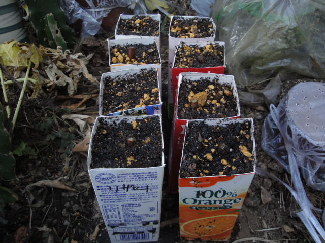 右のページで比較的発根率の良くないフェイジョアの挿し木の状況をご紹介しています。 フェイジョアの繁殖 変形牛乳パック挿し 欧州系葡萄の挿し木が、発根初期成長後の成長が悪い為、雨避け栽培が容易に行えるよう、牛乳パックに挿し木し、ビニール袋に入れ育てています。 牛乳パック挿しの各種木種の例は、右のページでご紹介を行っています。 牛乳パック挿し 2010年の状況