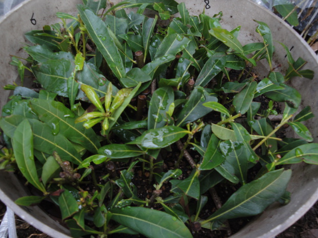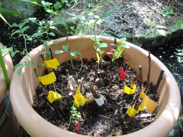 挿し木について これまで、色々な品種の果物を育てる為、主に一本かそれ以上の台木を用意し、その台木に接木していたのですが、それだけでは以下の様な幾つかの問題点が出てきています。 @接木が難しい品種やそもそも台木が無い品種の穂木を入手出来た場合の品種保存 A台木と穂木との相性を確認する為の台木量の確保 Bブルーベリーや矮性台の様に比較的多くの台木を必要とする場合の台木量の確保 C台木用品種の確保 そこで、挿し木により木種の保存を行ったり、台木の増殖を試みていますが、以下の様な課題があり、それにに応じた方法にて実施したり、実施方法を模索しながらの挿木となっています。 @潅水が自由に出来ず、最大2週間程潅水無しに成る事(木種全体) A発根が困難な木種があり、挿し木の時期や方法のノウハウ獲得。 そこで、@の潅水が自由に出来ない問題点を解決する為、池に鉢を入れて育てる 「池ポチャ方式挿し」、Aの問題点解決の為、時期や挿し方を色々変えたり、挿し穂を密封する等の方法を試しています。 それらの失敗の経験を元にして、毎年少しずつ方法を変え挿木を行っています。 2020年の挿木の様子 − 前年度までの経験を元に、土は菌の少ない赤球土や鹿沼土を使用、水切れ防止の為トロ箱への挿木の場合底に少し水が溜まる様工夫、葉を着けた新枝の挿木は、乾燥防止の為密封式とした。 池ポチャ挿し 以下は2009年の挿し木結果です。2009年は、ブルーベリー以外失敗が多かったのですが、原因は接木で余った枝の挿し木が多く時期が遅れ気味だったことに加え、日射量の調整を行わなかった事、虫やナメクジ等の食害の対策を怠った等によると考えています。 2010年は、2009年の失敗の結果を踏まえ、挿し木の時期等失敗の原因に対する対策を行い、成功率を上げたいと思っています。 池ポチャ方式の各種木種の例は、右のページでご紹介を行っています。 池ポチャ方式挿木2010年の状況