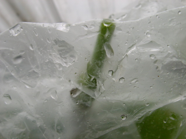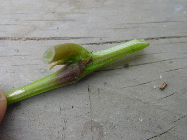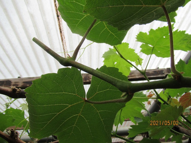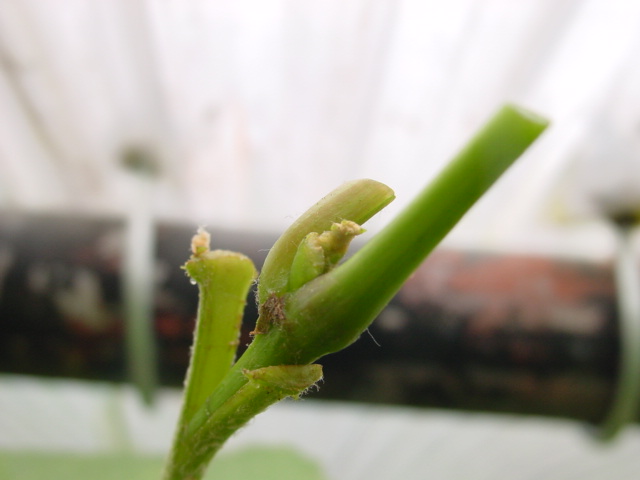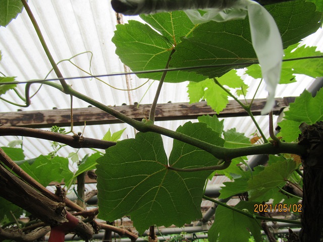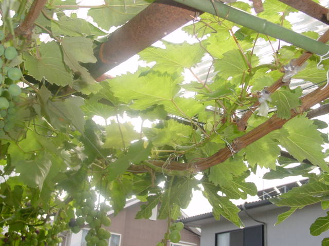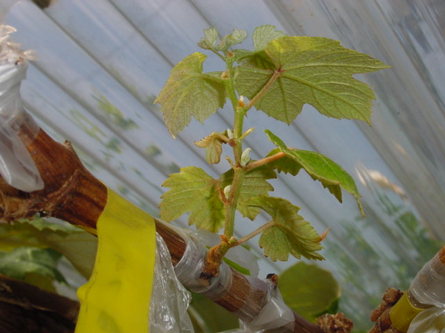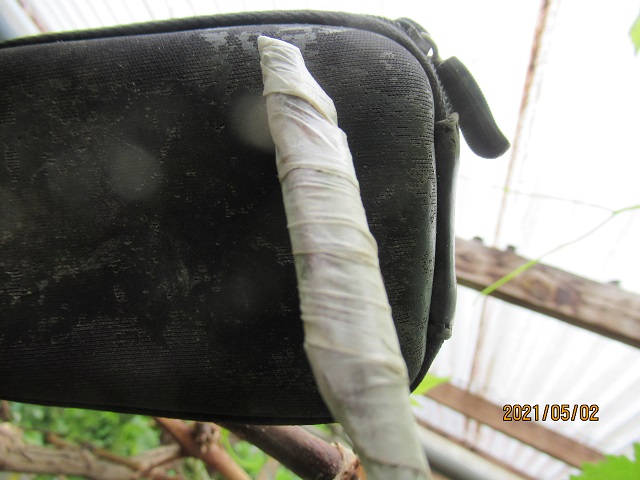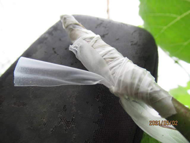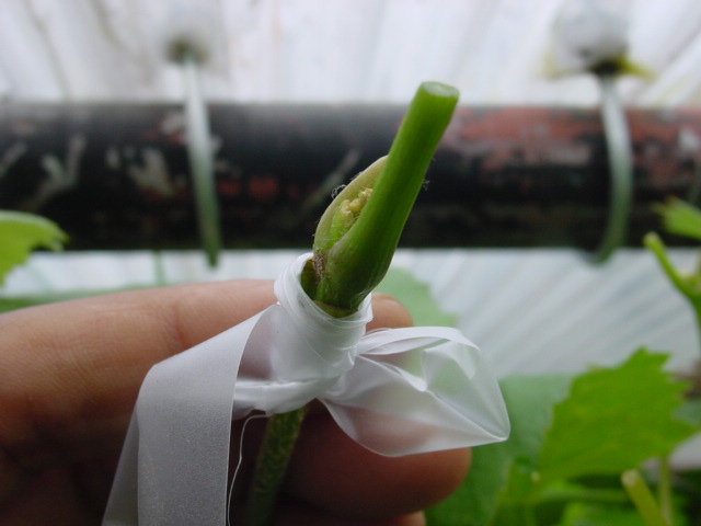 A葡萄の緑枝接ぎ: 緑枝接ぎは、比較的簡単に接木出来、しかも成功率が高いので、宮菜園では一番多く用いている手法です。呼び接ぎと異なり同時に同じ場所に植えてある必要も無いので、知人から枝を譲り受けたり、自由な位置に接木したりすることが可能です。欠点は長距離(長時間)の輸送が出来ないという点であり、輸送に時間がかかるような場合、一旦休眠枝を接木し、その苗から成長した枝を利用様な手間が必要になります。緑枝接ぎは、新鞘が勢いよく伸びる4月中旬〜6月下旬位まで可能ですが、遅くなると接ぎ穂に被せたポリ袋の中が高温になりすぎ枯れ易くなるほか、その後の成長期間も短いので失敗の可能性が高くなります。 以下に緑枝接ぎの手順と実施例を載せてみました。