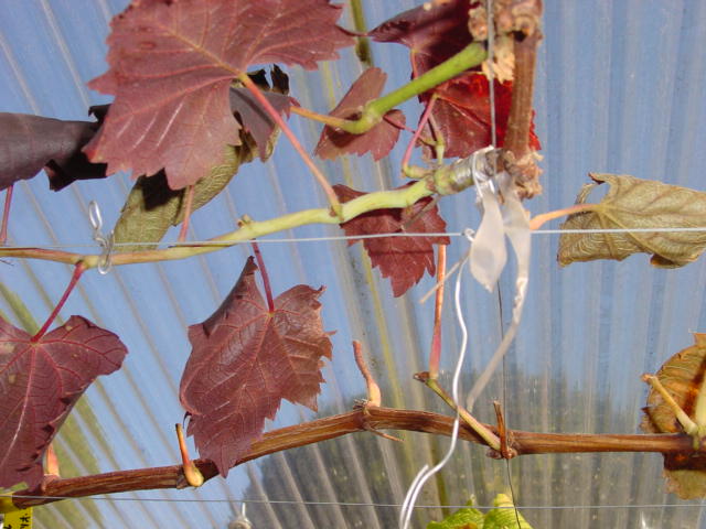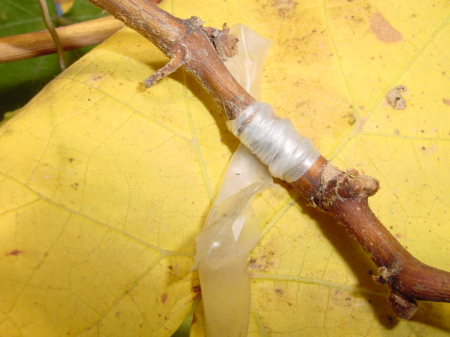 葡萄の接木実施例 色々な果樹の接木を行って来ていますが、葡萄の高接ぎは少々難しい部類に入るようで、入手する穂木の内容や目的により、幾つかの方法うぃ使い分けて実施する事が必要と判断しています。これまでの経験から葡萄の接木が簡単でないのは以下の理由によるようです。 @枝を切ったとき樹液が大量に出る時期があり、接ぎ穂の採取時期と接木の時期の見極が単純ではない A台木が固く、又充実した穂木は太くなりがちで、接木の作業自体が難しい B樹勢のバランスが崩れ易く、負け枝になり枝ごと枯れてしまう事も多い。 Cせっかく接木した芽が伸びても、登熟しないで枯れてしまう事も多い 一方、このような点を上手く解決出来れば、短期間でで立派な実を付ける枝に成長させる事が出来るという特性も持っており、安定した接木を実施出来るよう、可能な方法と多めの実施例を載せて見ました。 葡萄の接木は、以下の方法で行う事が可能ですが、現状はC緑枝へ休眠枝を接ぐ方法を最も多用し、多品種接ぎの枝の整理・統合などの為A休眠枝接ぎも利用しています。 @呼接ぎ A緑枝接ぎ(緑枝へ緑枝接ぎ) B休眠枝接ぎ(宮式及び切接ぎ) C緑枝へ休眠枝接ぎ @呼接ぎ 新鞘同士を削り、削った部分をお互いに密着して縛っておくという手法です。初心者でも成功の確率が高い方法であり、宮菜園でも最初にこの方法で接木しました。それほど細心の注意が必要ではありませんが、お互いまだあまり固くなっていない新鞘の葉の付いた節の部分を削って付ける様にすると良い様です。尚、実施例の写真ではポリテープで縛っていますが、収縮性のある接木テープで縛ると縛ったくびれが残りにくくなります。呼び接ぎで一番失敗の可能性が高くなる要素は、台木と穂木いずれかの登熟に失敗すると言う事の様です。両方とも秋にしっかり登熟する様、日当たりを良くし、頂芽部分に近い条件の良い新鞘どおしを利用すると良い様です。
