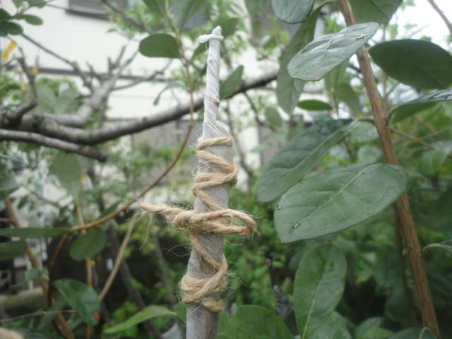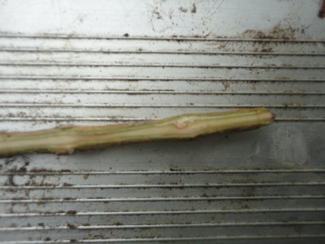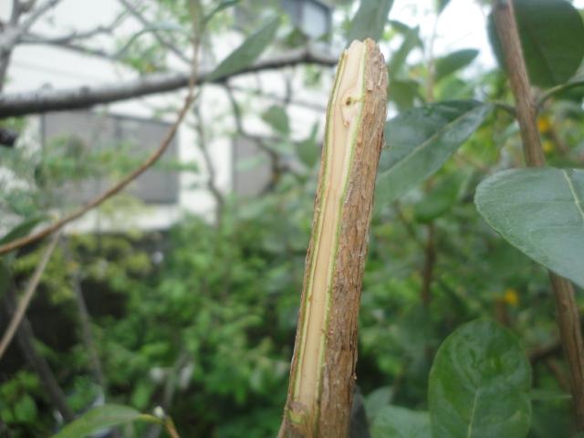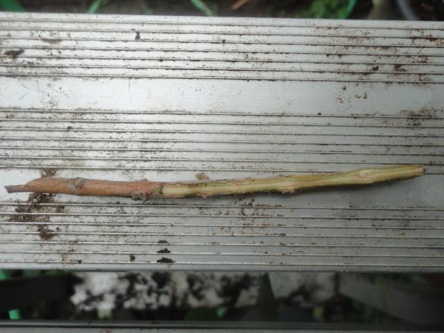 変形切接方式 真冬から初夏までほぼ時期を問わず、比較的簡単に出来る宮式高接方式による接木を長年行って来ましたが、宮式高接方式では以下のような欠点があり、接木が不可能に近かったり、失敗し易かったり、作業が困難な場合がある事がわかりました。 @宮式で実施したフェイジョアの接木は一回も成功しませんでした。又、ブルーベリーも芽は出るものの、成長までいけるケースは多くありませんでした。 A太い穂木を頂いた場合、接木が非常に困難でした。 B基本的に一個の芽しか接がないため、その芽が虫に食われてその後発芽しなかったり(桃等)、芽に樹液がかかり発芽出来なかったりする(梅等)場合がありました。 これらの欠点をカバーする為には切り接ぎが良いのですが、通常の切り接ぎが実施出来るような理想的な枝が入手でき、また台木の枝が用意出来るとは限りません。そこで、概ねどのような枝でも対応出来るよう、穂ギ、台木とも皮ぎりぎりまでのカットとし、穂木を出来るだけ長くした接木を行うようにしました。 この方法は、従来の接木テープでは不可能に近く、近年発売を開始したメデールの様な新しい素材の接木テープの採用により可能となりました。 特長 穂木と同じ位の太さの枝からかなり太い枝にも接木可能。(ただし、最良なのは台木より穂木が少し細い位のもの) 自由な位置に複数箇所の接木が可能。 作業が容易。(高度な熟練が無くても成功率が高いと言った方が良いかもしれません) 方法