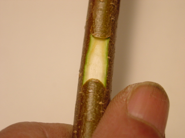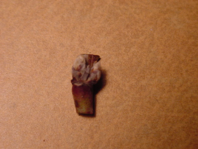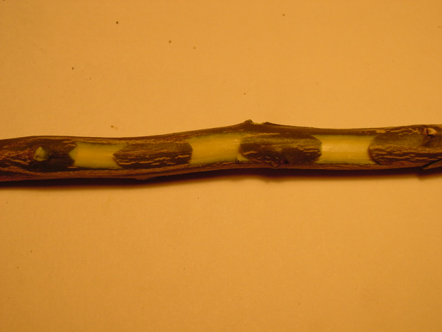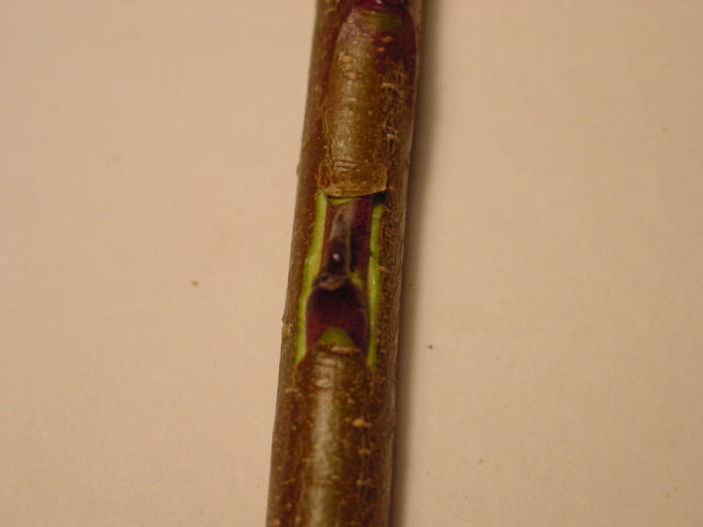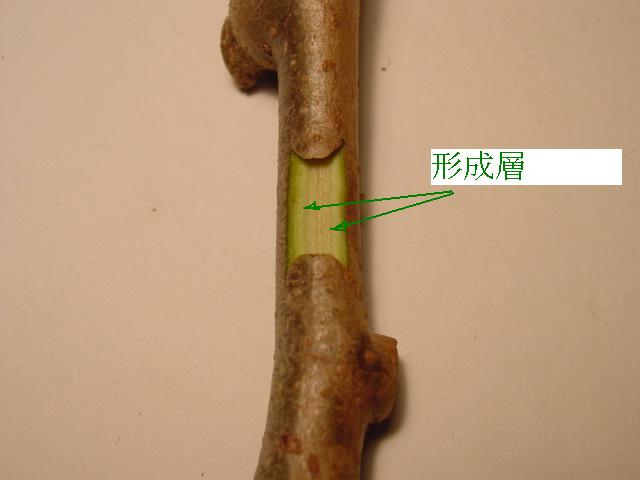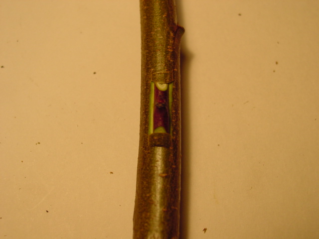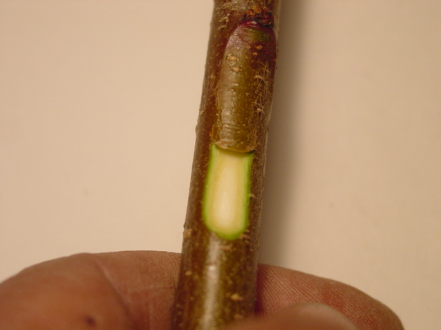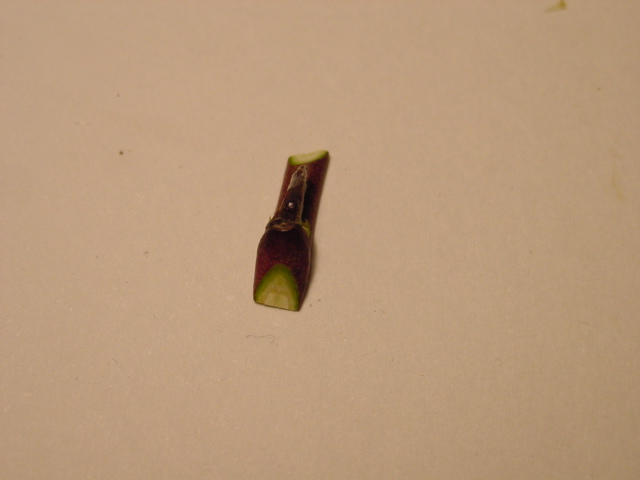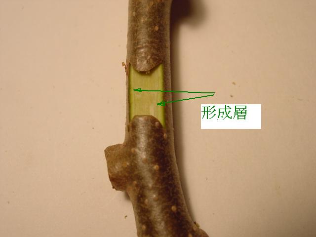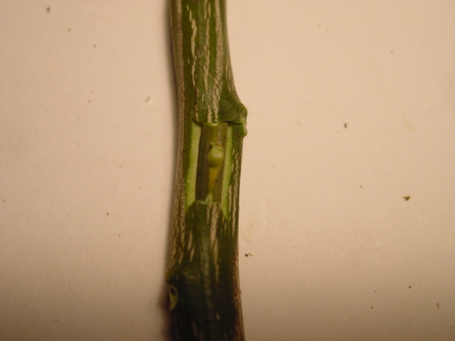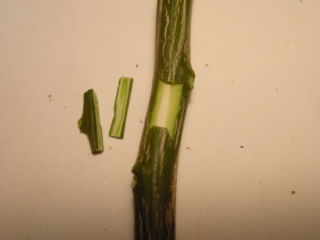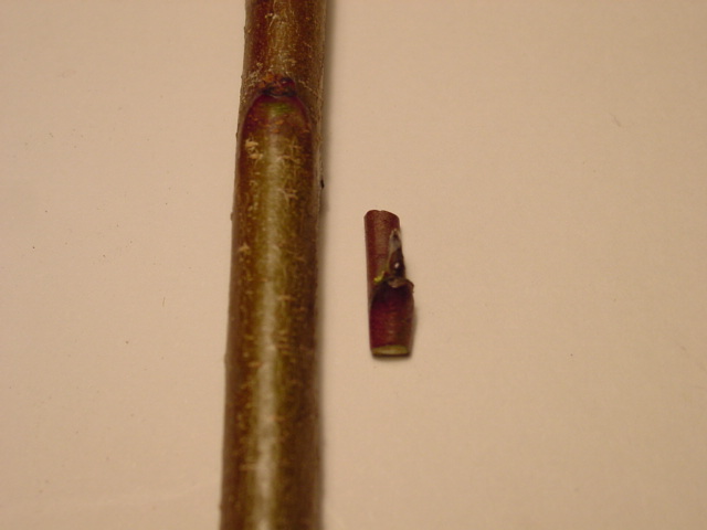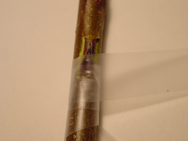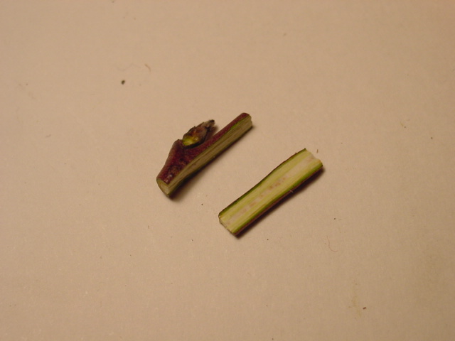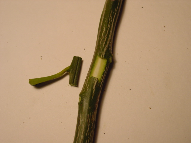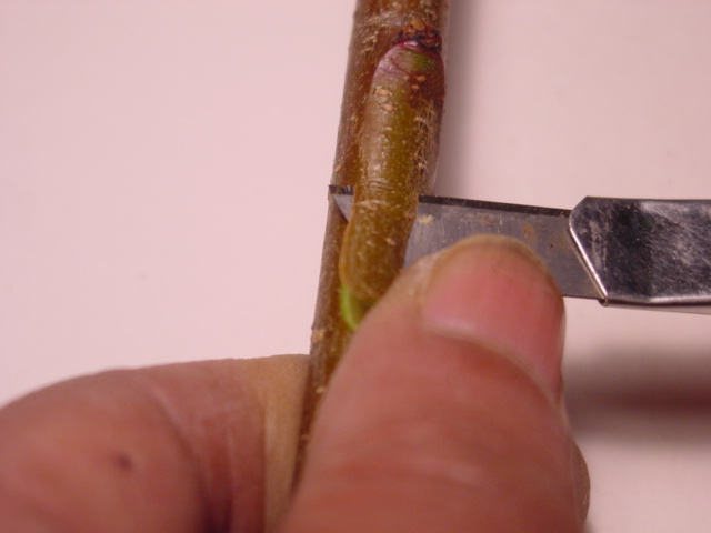 A左右の花芽を掻きとり、中央の葉芽だけにした状態の穂木です。 |
