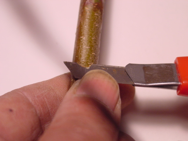 E適当なところまで削ったら穂木を押さえる為の切りこみをいれます。