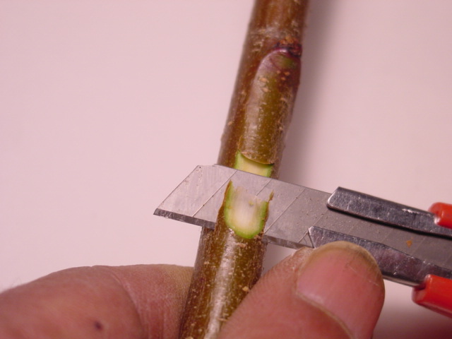 | B左が台木、右が花芽を掻き取った穂木です。概ねこれくらいの太さの違いがあると作業が容易で成功率も上がります。細い穂木しか入手出来ない場合、台木も細めの方が接木は容易ですし、穂木が太い場合台木も太くないと接木は難しくなります。 |