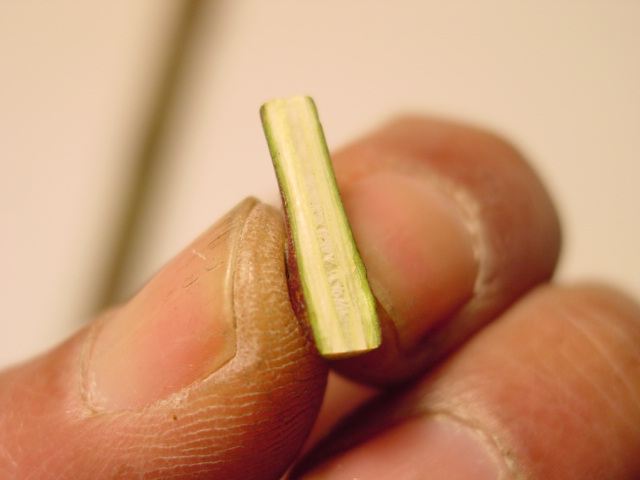G飯台方向にも切りこみを入れて台木の切りこみは完了です。この例では握っている方が根元の方向ですが、心持根元の方が深く削り過ぎです。先端部方面の方が理想的な深さに削られています。 |