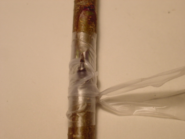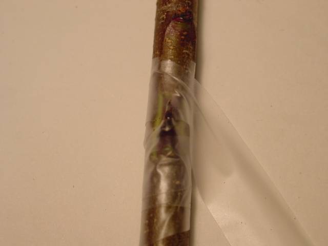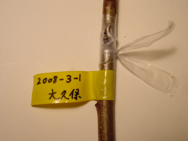 O接木する種類が多い場合、忘れない様に接木した日付、品種名などを記載したビニールテープを巻いておくと良いでしょう。ビニールテープを長めにしおけば、枝が太ったぶんだけテープの接着がはがれ、かなり年数が経ち幹が太くなっても表示しておくことが出来ます。 |