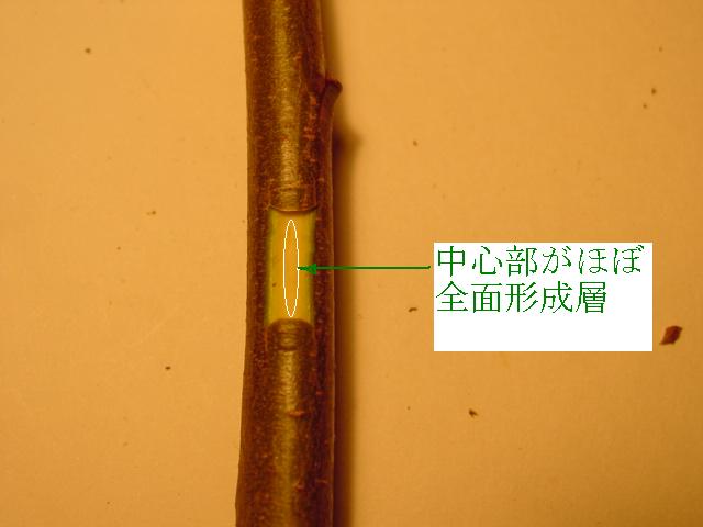 | H穂木を削る前に半分に割ったところです。割っただけでは表面がでこぼこしており、うねりがある場合もありますので、軽く削り平らにします。 |