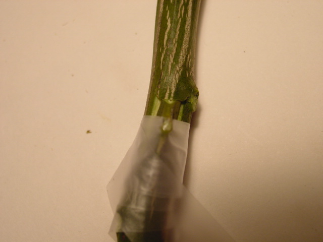 | N最後にテープをより合わせた上で台木と穂木を強めに縛り(こうすると多少うねりや隙間があっても密着します)、ほどけ無い様に結んで完了です。 |