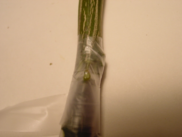 M芽の部分だけ残して密封状態になる様接木テープをまいていきます。芽の部分にはテープをすべり込ませる様にすると隙間無く巻けます。 |