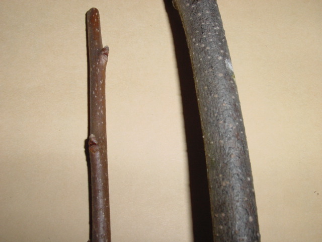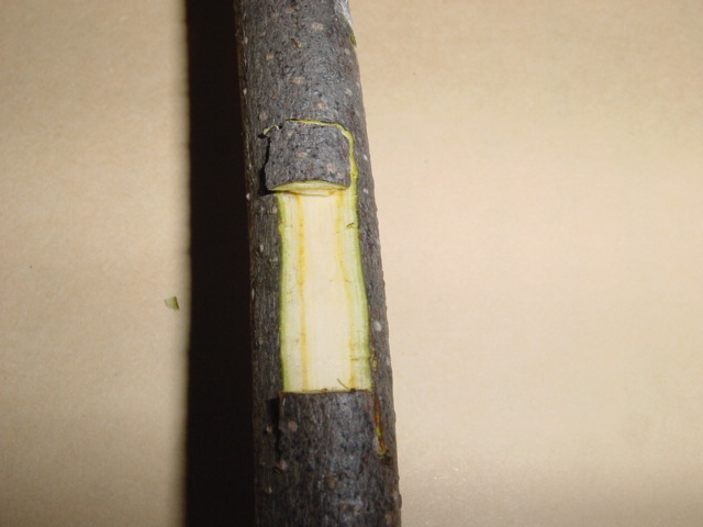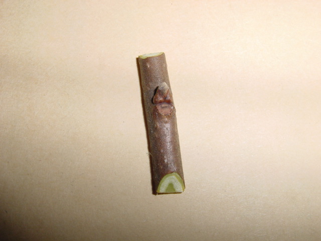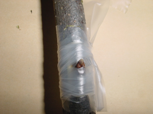 その他注意事項など @台木の接木した部分より先の方の枝を残したままでも接木は可能ですが、接木した部分が良く生長するためには、穂木以外の新芽は掻き取った方が穂の成長は早い。 台木の接木した部分より先を残すのは、失敗した場合に再度接いだり別の品種を接ぐ等の単純な理由の他、木の種類によっては枝を長く残すことにより負け枝になる事を防ぐ目的もあります。原則として残した枝の芽は早めに全部掻きとりますが、穂木から出た芽のほかに先端の方から出た台木の芽も少し残した方が、接いだ枝の枯れこみの可能性がなくなると同時に、穂木の成長も早い事が多い様です。私の場合、接いだ先は最低20cm程度、場合によっては50cm位残しておき、接ぎ穂の支柱に利用します。又、台木の芽は全部掻き取ると説明しましたが、掻き取っても又芽が出てきますので、そのうちの一部は少し残し、台木が完全に枯れない様にしています。2年程して穂木の方が太くなってから台木を剪定するのが理想的な様です。 A穂木は台木より少し細め位が、形成層を合わせやすく、テープでの乾燥防止の密閉が容易。 B古い枝は皮が厚いので形成層の位置に注意が必要 Cカットした穂木の長さが、台木の切り込みよりわずかに短い位にすると、穂木を取りつけたとき密着し易く、そのままにしておいても脱落しないので、テープを巻くとき用意であり位置ずれ等が起きにくい D通常は芽だけ出す様にするが、特に乾燥防止をしっかり行い成功率を上げたい場合、芽の部分もテープで覆う事も可能です。この場合芽が動き出してきたら少し切り込みをいれる手間が必要になる。 E穂木を半分に割った後、カンナで削る様に軽く削り平らにすると成功率が上がる様ですが、細い穂木の場合テープで強く縛ることにより、多少よじれなどがあっても活着する事が多い様です。 Fテープは広げた状態で巻き気密性を保持する様にするが、最後はテープを丸め気味にして芽の上下を強く縛る様にすると密着性が高まる G接木した果物の種類は接木テープに直接油性のサインペンで記入してもしばらくは大丈夫ですが、確実に長期間記録を残す為には、ビニールテープに品名を記入し、巻きつけておいた方が安全です。 H穂木の保存は、密封性の高いポリ袋等に湿った布や水苔等と共に入れ、冷蔵庫で保管します。ポリ袋は破れ易いので、ポリ袋をさらにビニール袋に入れ2重にして保存すると安全です。柿では適度な湿度を保つことにより、一年以上保存した経験もありますが、水分が多すぎると黒カビ等が発生し、穂木の内部まで黒く変色し穂木が腐食することがありますので、長期間保存する場合、穂木をポリ袋に入れ、外側に湿った布等を入れ、全体をビニール袋に入れるのが良いでしょう。 穂木は乾燥して干からびてしまうのが最悪ですが、水が滴るほどの過湿も芽や幹自体の腐敗の原因になりますので注意が必要です。 2018年1月21日更新 |
