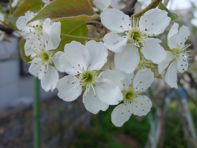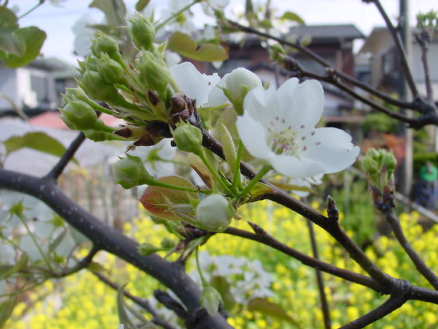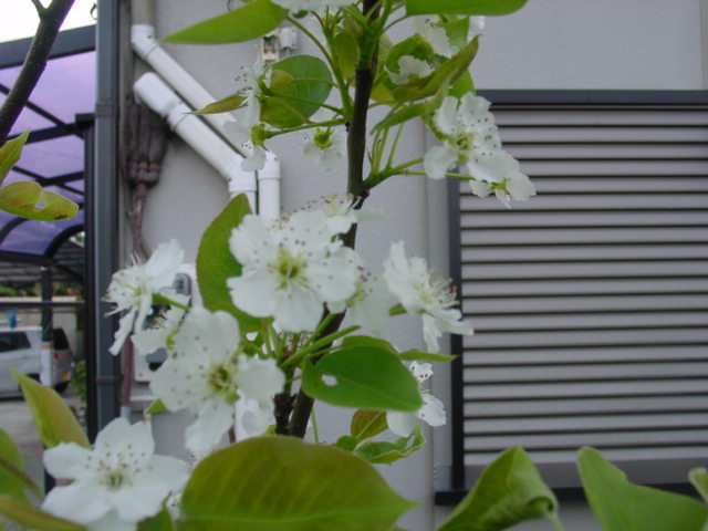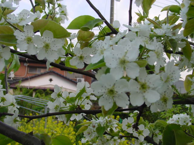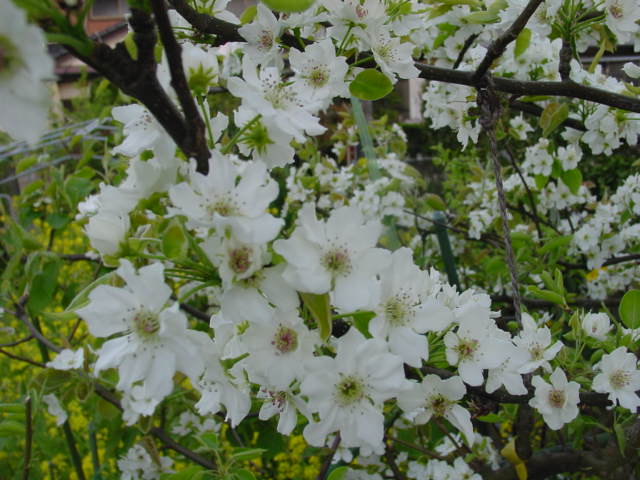 観察記録− 2009年4月12日 梨の花、接木 昨年までに接木した品種はル・レクチェ、明水をの除いて、量の差を別にすれば全て開花しました。今年は、以前から欲しいと思っていた新水と南水を思いがけず頂く事となり、一部欲しいと思っている品種を除いて和梨の品種はほぼ全てそろいました。今後は熟期が愛宕と新高の間を埋める品種と、洋ナシをある程度そろえられれば、品種は概ね十分と考えています。今年一年だけでは完全には判らないのですが、花の時期もほぼそろっており、概ね人口受粉無しでも着果は問題ないと思っています。