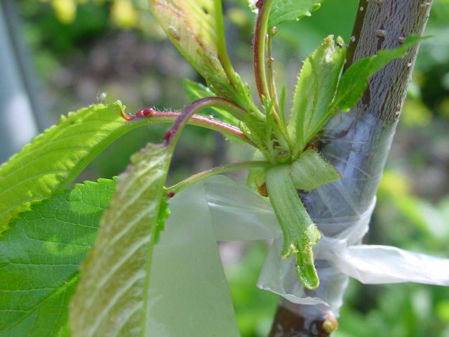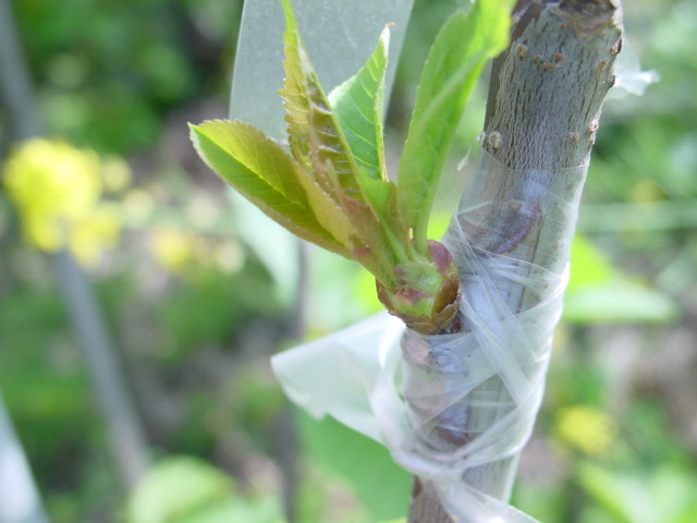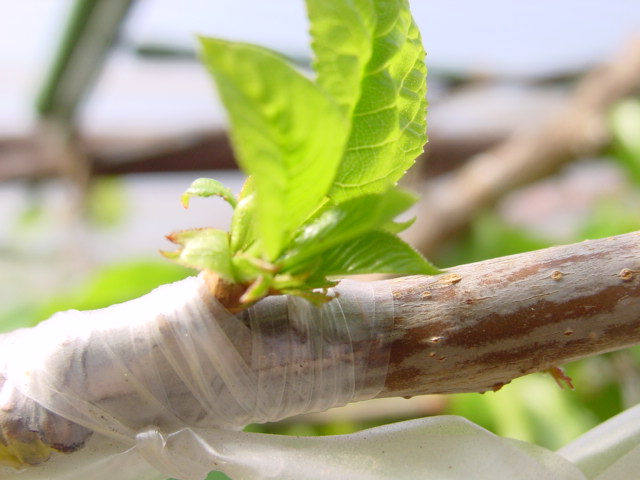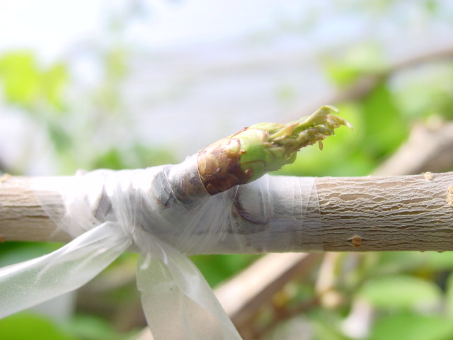 観察記録− 2009年4月18日 サクランボ接木 塩崎さんのご好意により新しい品種が幾つか入手出来ました。頂いた穂木は、ポリカの屋根の下で育てている水門及び暫定的に育てているアメリカンチェリー等の苗木に接ぎました。現在のところ芽が出るのが遅い部分もありますが、ほぼ芽が動き出してきました。台木の枝はカットしないでありますので、もう1,2週間様子を見て、芽の動きが悪い品種については接ぎ増しを行う予定です。