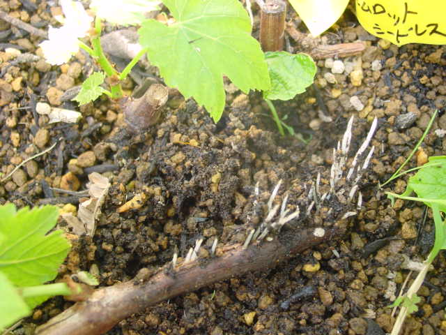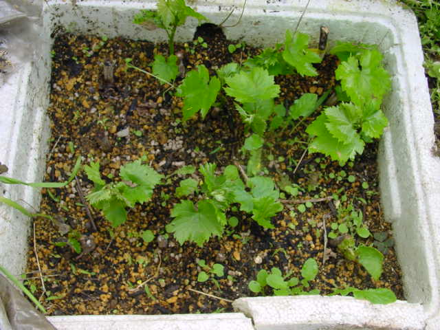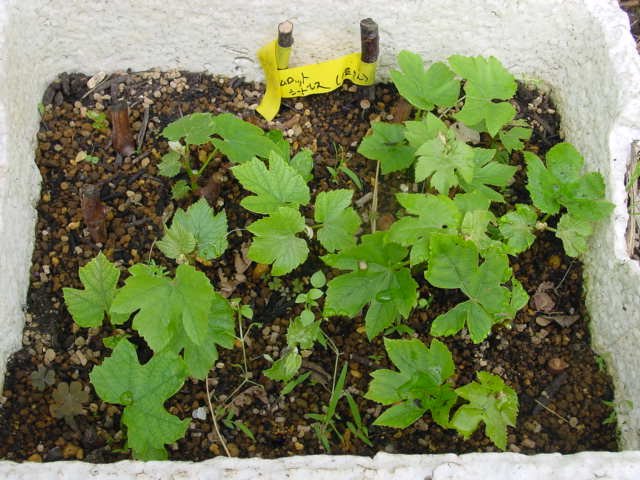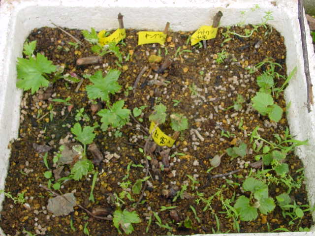 観察記録− 2009年4月19日 葡萄挿し木、新芽掻き 阿部さん、塩崎さん、亀永さん、山田さん、のご好意により、新しい品種が幾つか入手出来ました。頂いた穂木は、5月に予定している休眠枝接木の分を残して、挿し木を行いました。残念ながら、宮菜園では葡萄の休眠枝接ぎはまだまだ開発途上の技術であり、安定して活着するレベルに至っていませんので、当面は挿し木から出た新鞘を接ぐ緑枝接ぎを主流とせざるを得ません。とはいえ挿し木の方も、散水が一週間に一度位しか出来ない事から、かなり工夫しないと失敗してしまう状況です。 しばらくは挿し木、接木とも色々カットアンドトライが続きそうです。多品種を接いだメイン台木の方はほぼ安定して着果・収穫が出来る様になっていますが、そろそろ品種保持用の台木、品種特性に応じた台木(早生・晩生、ウイルスフリー台木、乾燥・過失への適応性)も検討する時期に来ていると考えています。