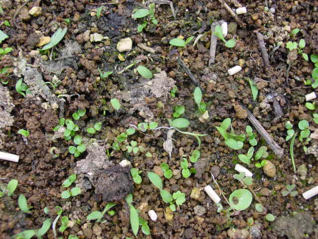 雑草が混じり少し見難いですが、丸っぽい葉の芽がG1の実生、すなわちゼスプリゴールドの孫たちです。 |