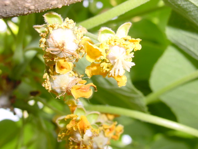 ゼスプリゴールド実生の先端部分の枝の雄花です。G2とG3の開花はほぼ同時期であり、これらの花はほぼ終了しつつあります。紅妃の受粉用にはほんの少し早熟の様です。 |