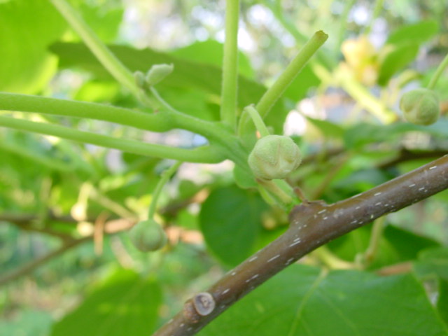 枝根元付近の開花が早い部分は既に花びらが散っています。 |