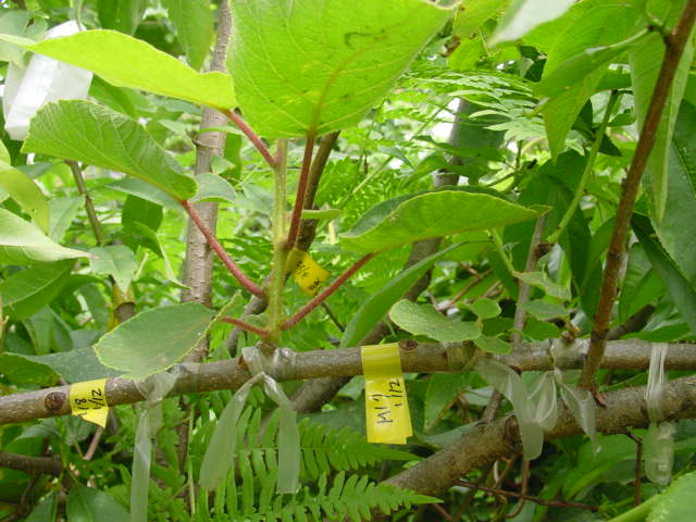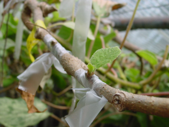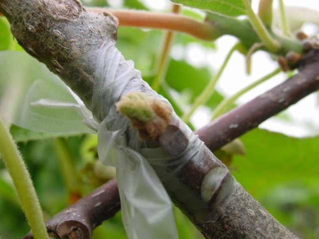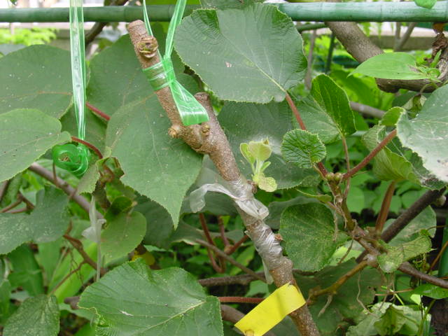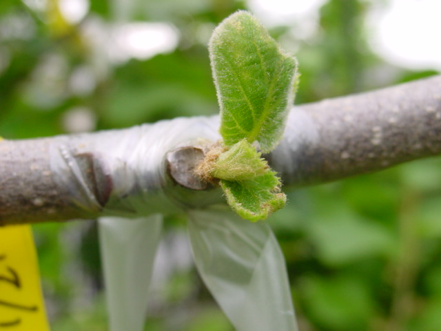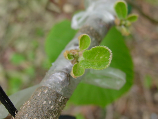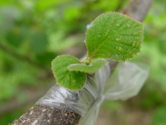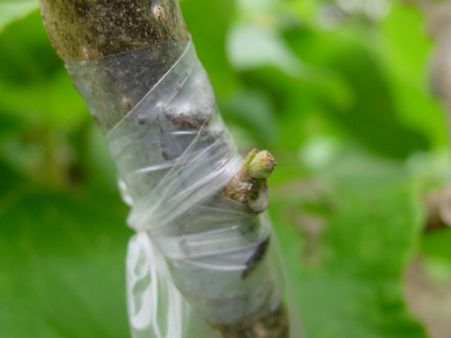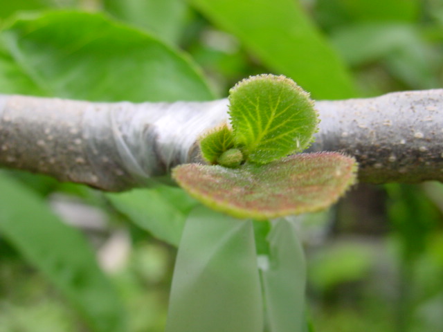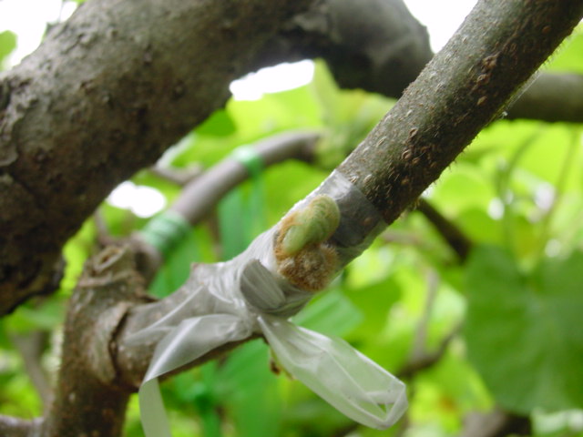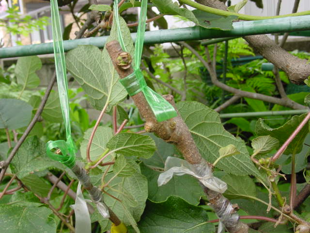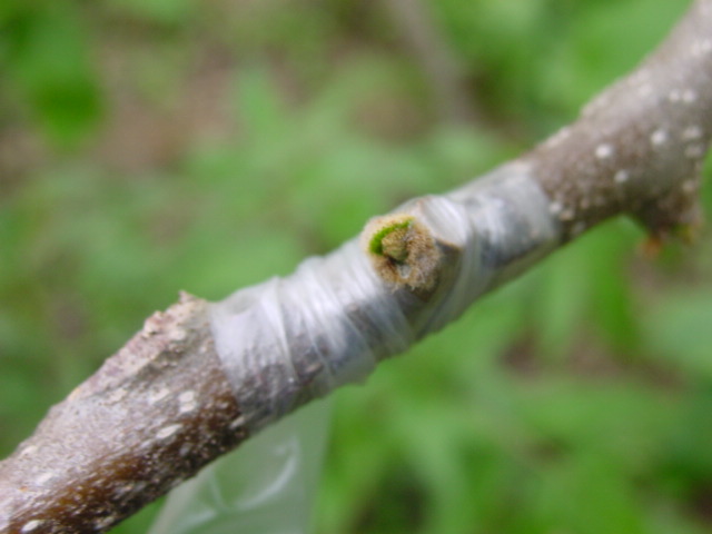 M14は、他の接ぎ穂に勢力を奪われ結局発芽しませんでしたので、6月28日に別の枝に接ぎ直しました。 |