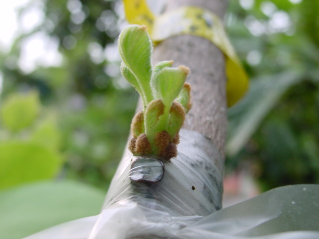 台木の枝の先端を持ち上げることにより、何とか片方の芽は成長を開始しました。 |
