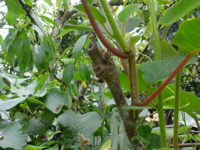 昨年の新鞘に接いだものです。なんせ勝手に宮菜園内に生えて来たものなので、本当のところはイエローか緑系か判りません。そのうち、紅妃やゼスプリゴールド実生の子供、つまり孫も混じる可能性大と思っています。 |