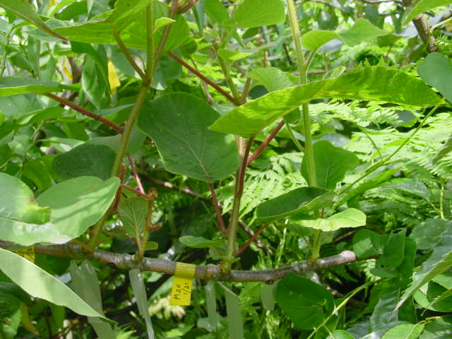 M14を接いだ台木の中間部分に接いだ品種。この品種は送れて発芽しましたが、勢い良く伸び出しました。この時点で一番下に接いだM14の発芽はあきらめました。 |