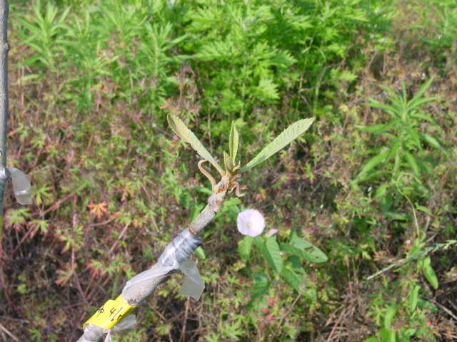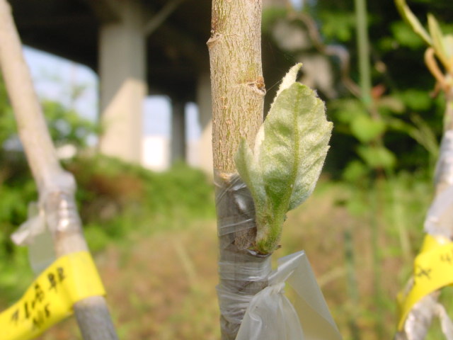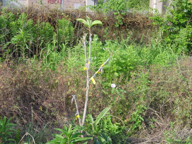 中間の位置の枝に割り接ぎしたものです。活着しているとは思いますが、勢いがありません。 |