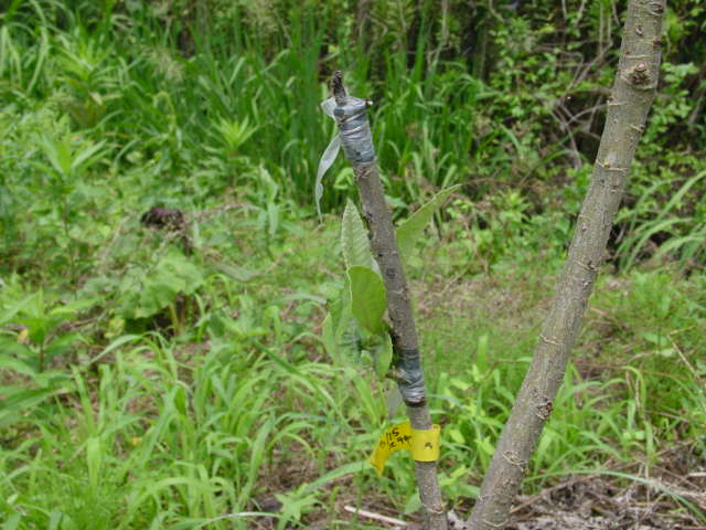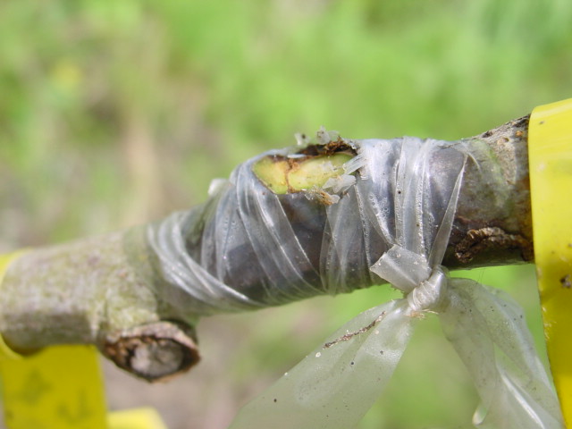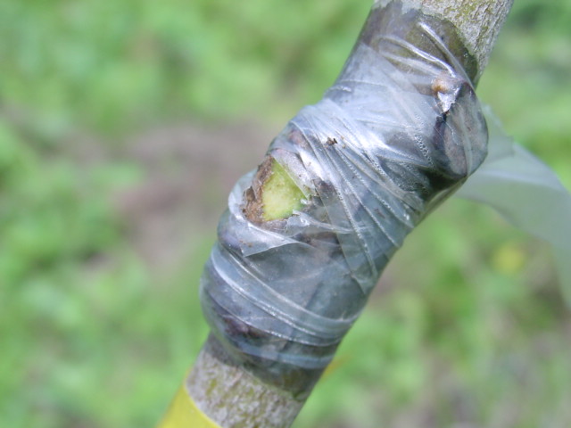 枝の途中に宮式で接いだものです。穂木は生きているのですが、先端の芽が勢い良く伸びると、この部分は芽が出ないかもしれません。